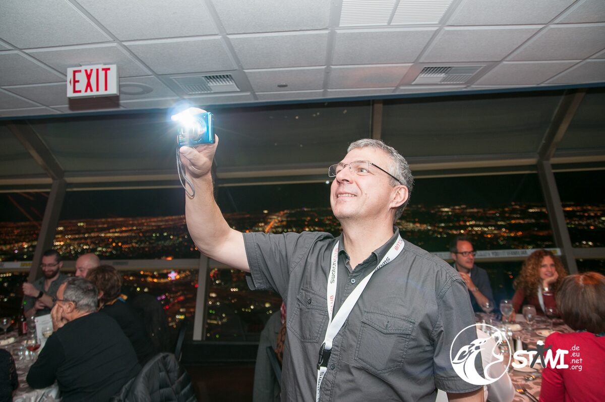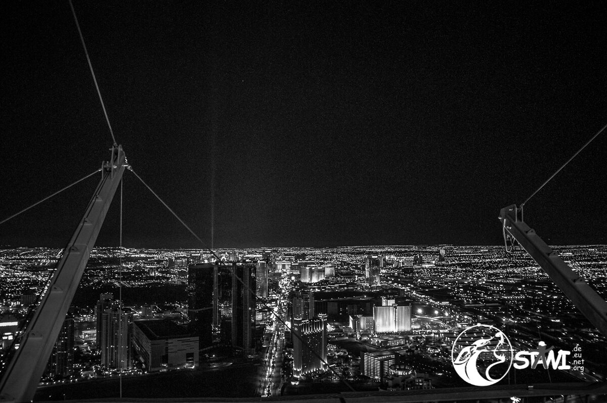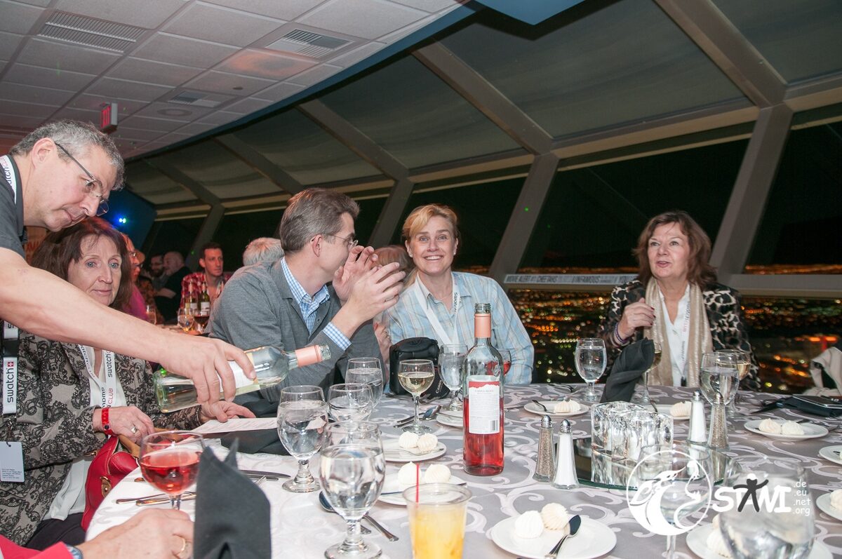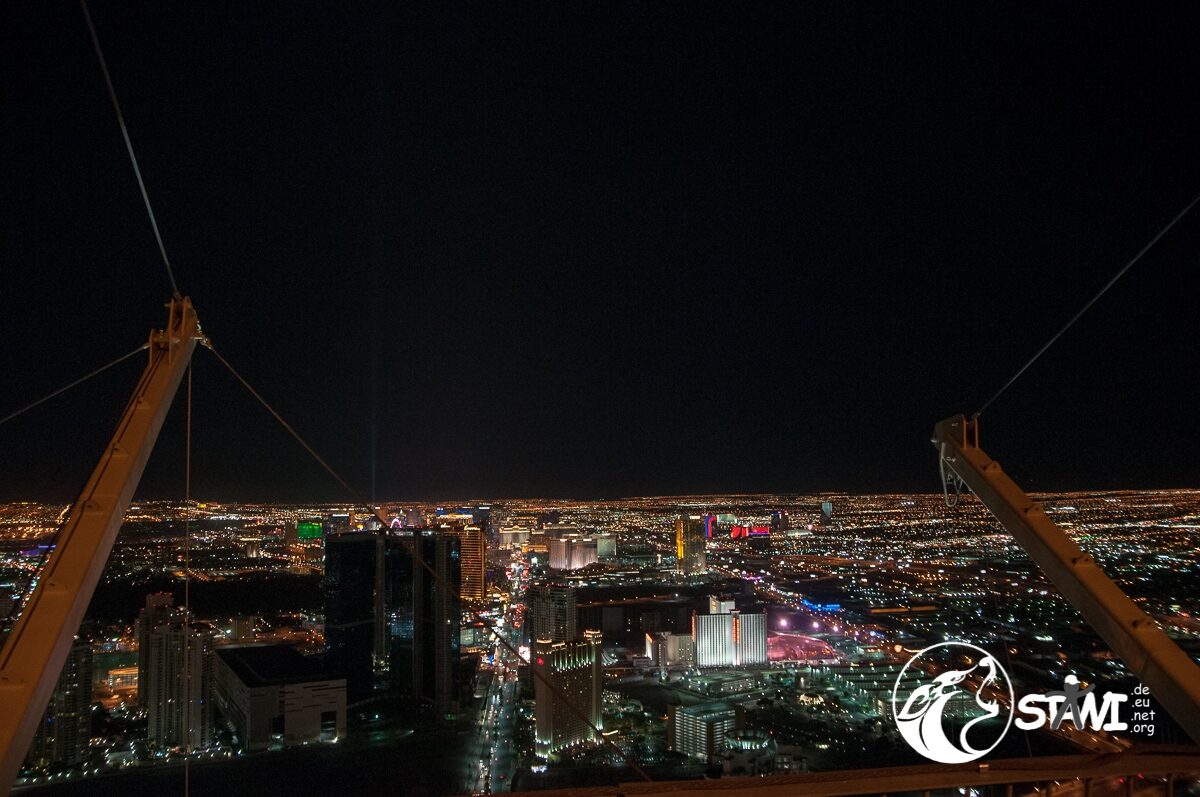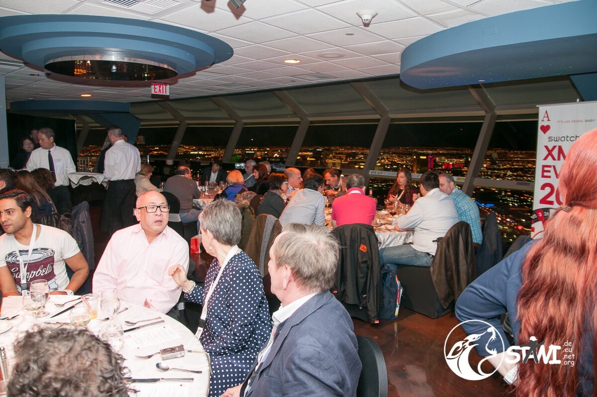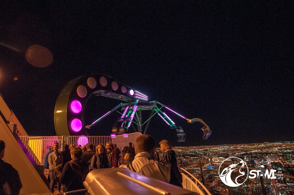 Dinner im Restaurant “Top of the world” auf einer Höhe von 800 feet, ca. 244 m hört sich erst einmal ganz entspannt an. War es auch, es sei denn, man probierte noch das eine oder andere Fahrgeschäft zwischen den Gängen aus. Jeder Swatch Member durfte Isanity, X-Scream und Big Shot ausprobieren, so oft er oder sie wollte. Und wer den Fahrgeschäften in fast 300 m Höhe nicht traute, der blieb im Restaurant und verfolgte fasziniert zwei Magiern bei Ihren Kartentricks.