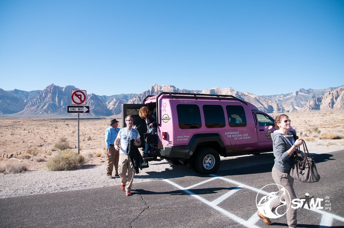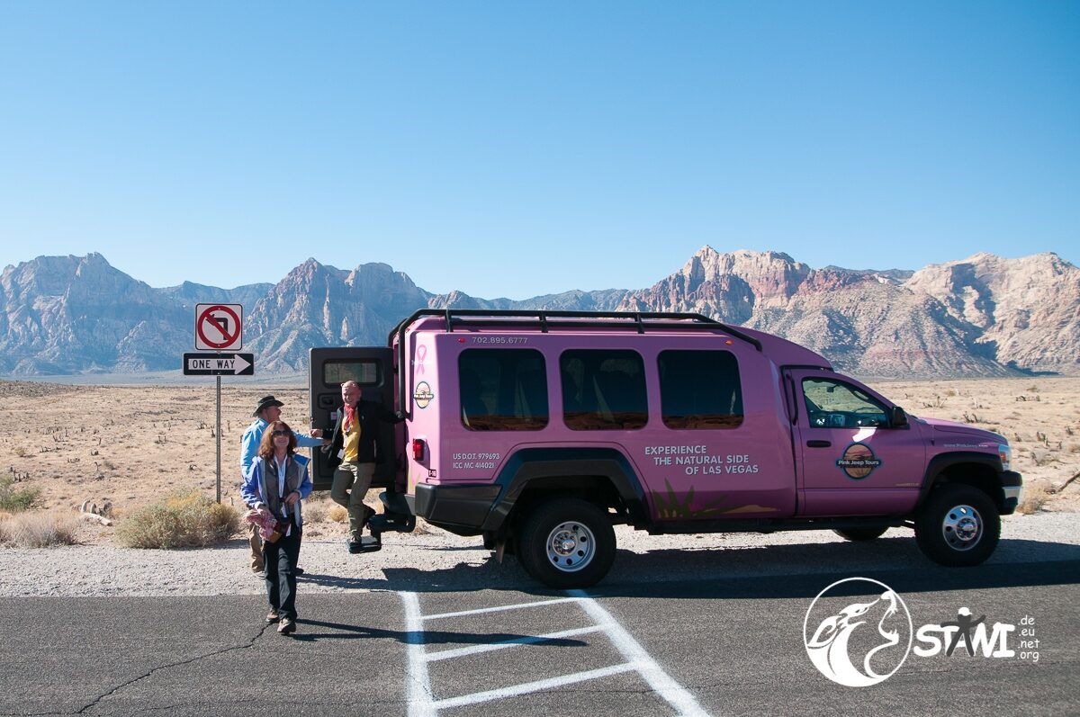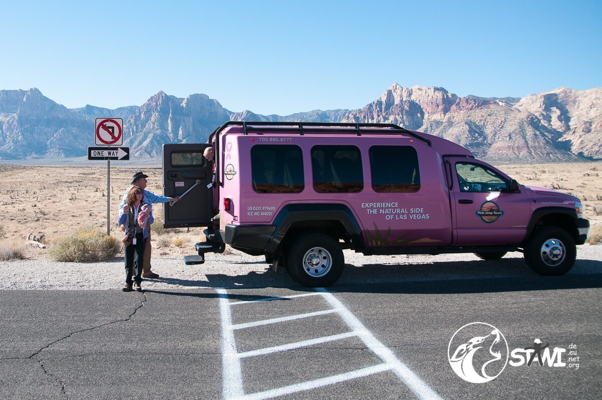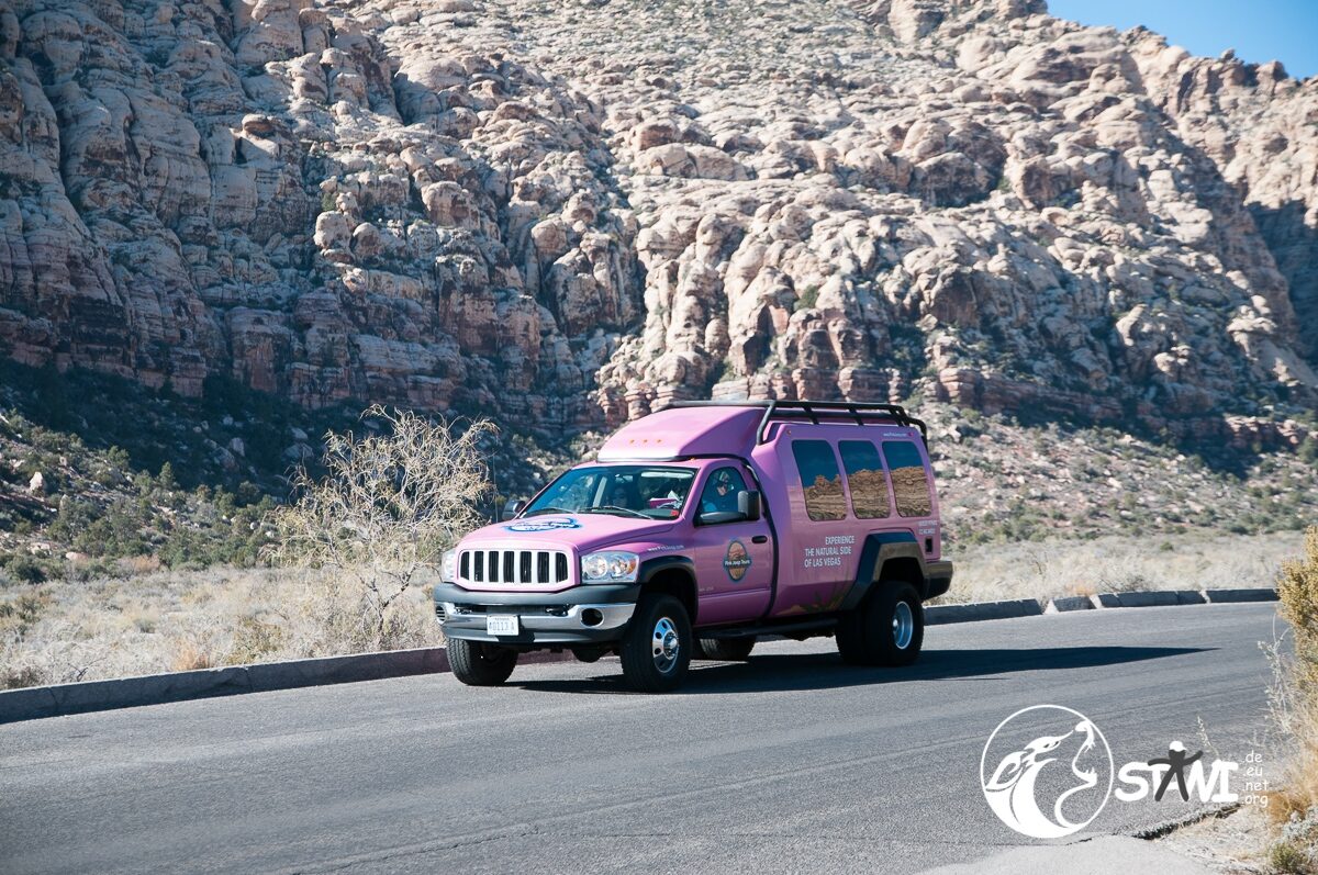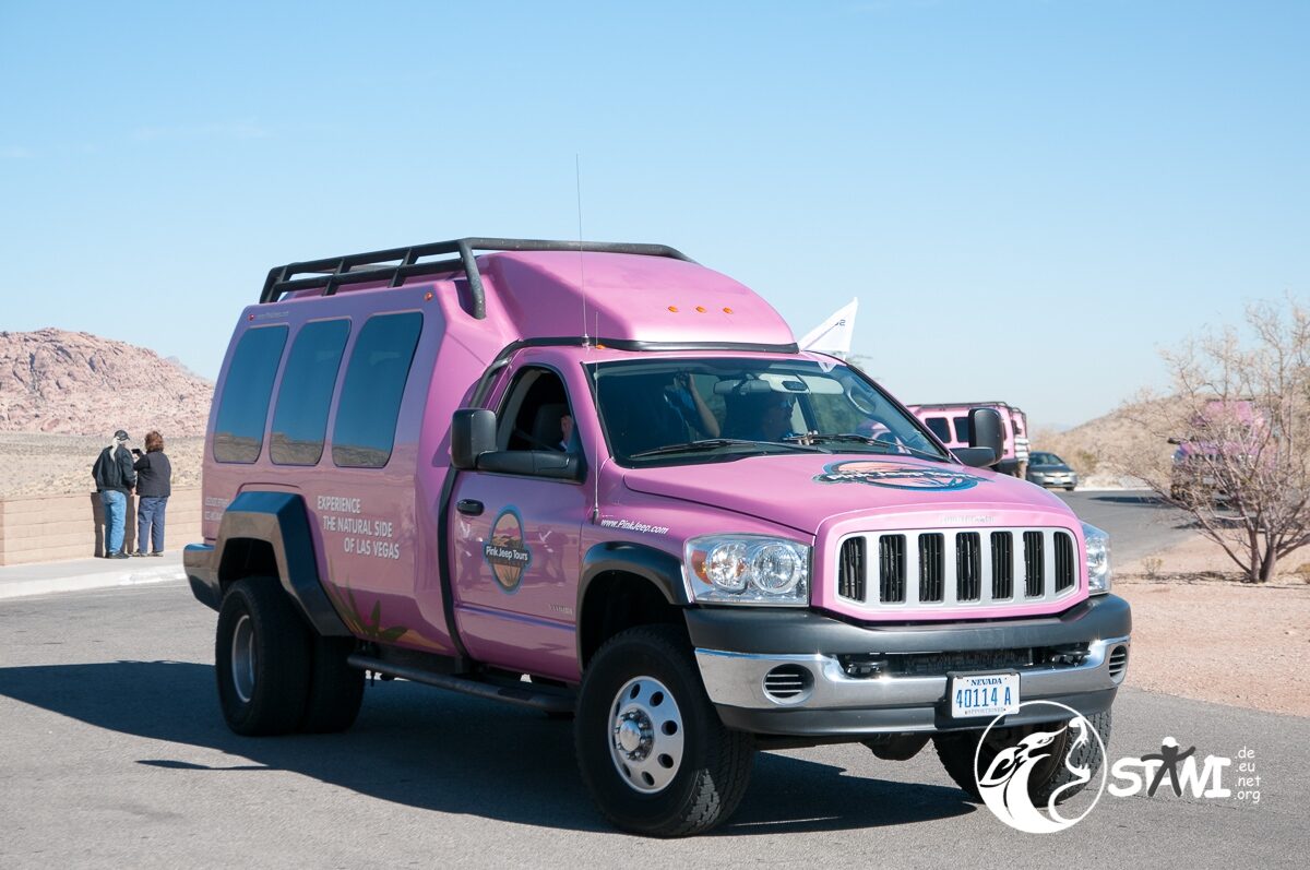 Wetter? Strahlend blauer Himmel und Sonnenschein. Ein guter Tag, um die Wüste zu fahren. Da staunten die Clubbies nicht schlecht, als zehn oder elf pinkfarbene Trucks vorfuhren. Erster Programmpunkt des Tages, mit Pink Jeep Tours nach Red Rock Canyon. Mit rund 9-10 Personen, pro Truck, ging es dann auch los.