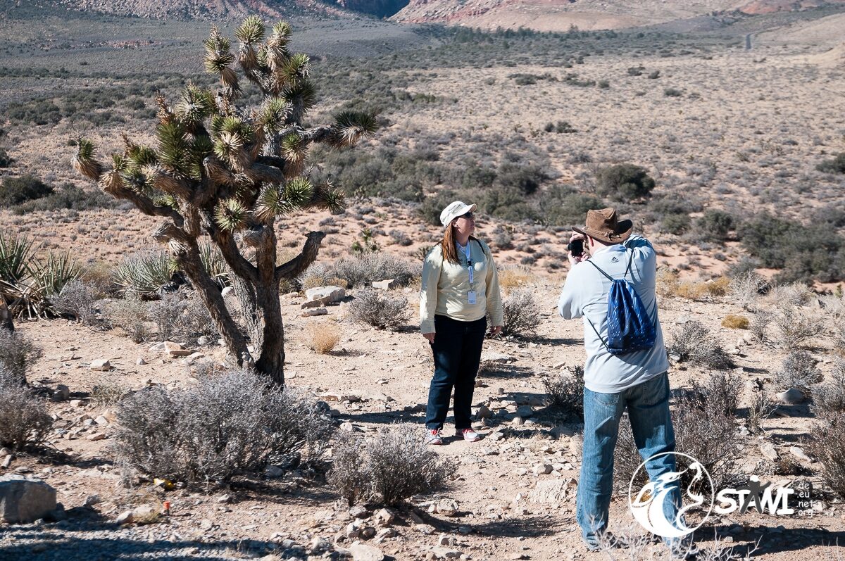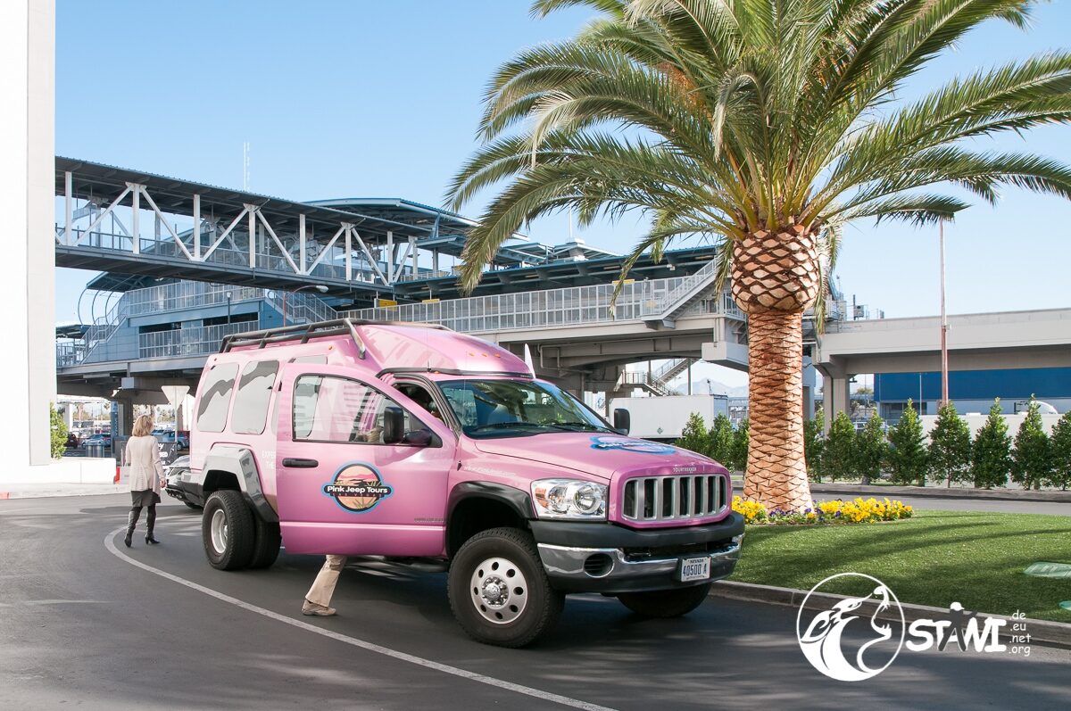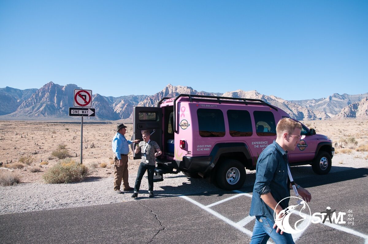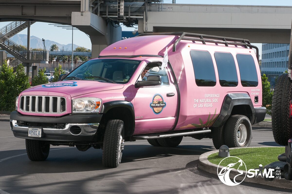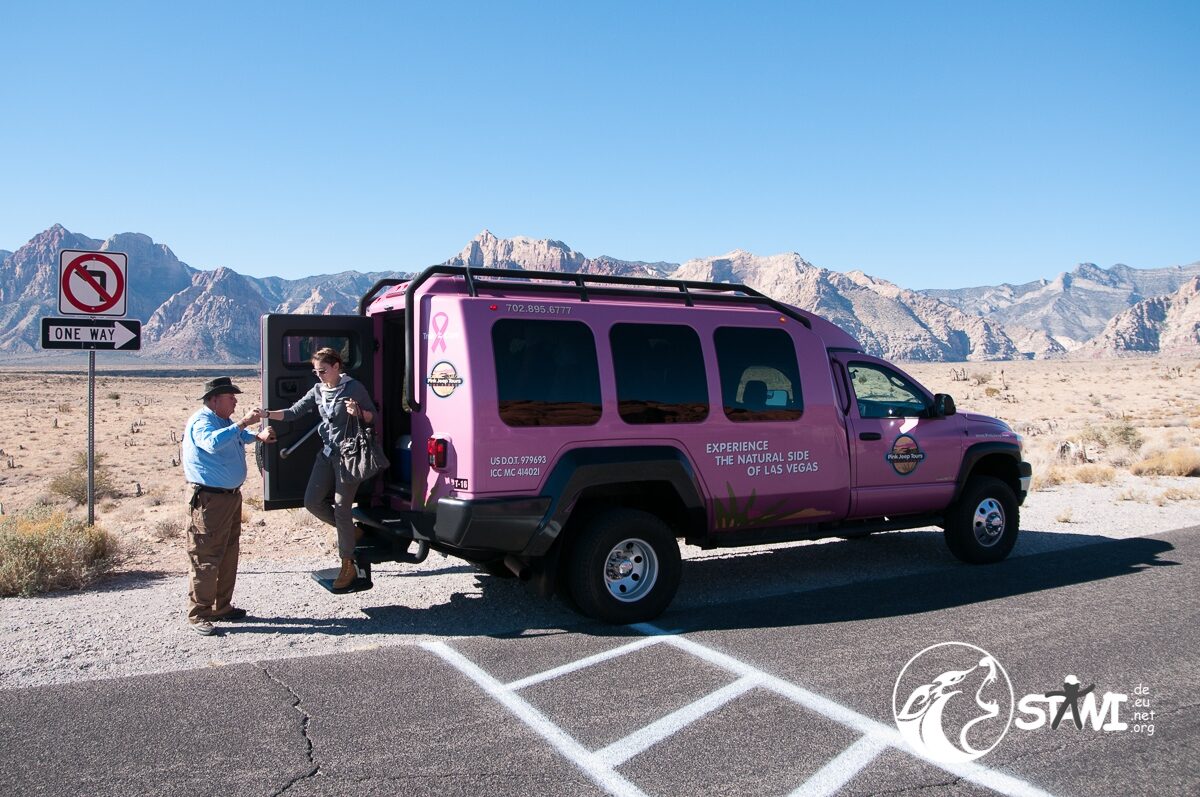 Wetter? Strahlend blauer Himmel und Sonnenschein. Ein guter Tag, um die Wüste zu fahren. Da staunten die Clubbies nicht schlecht, als zehn oder elf pinkfarbene Trucks vorfuhren. Erster Programmpunkt des Tages, mit Pink Jeep Tours nach Red Rock Canyon. Mit rund 9-10 Personen, pro Truck, ging es dann auch los.